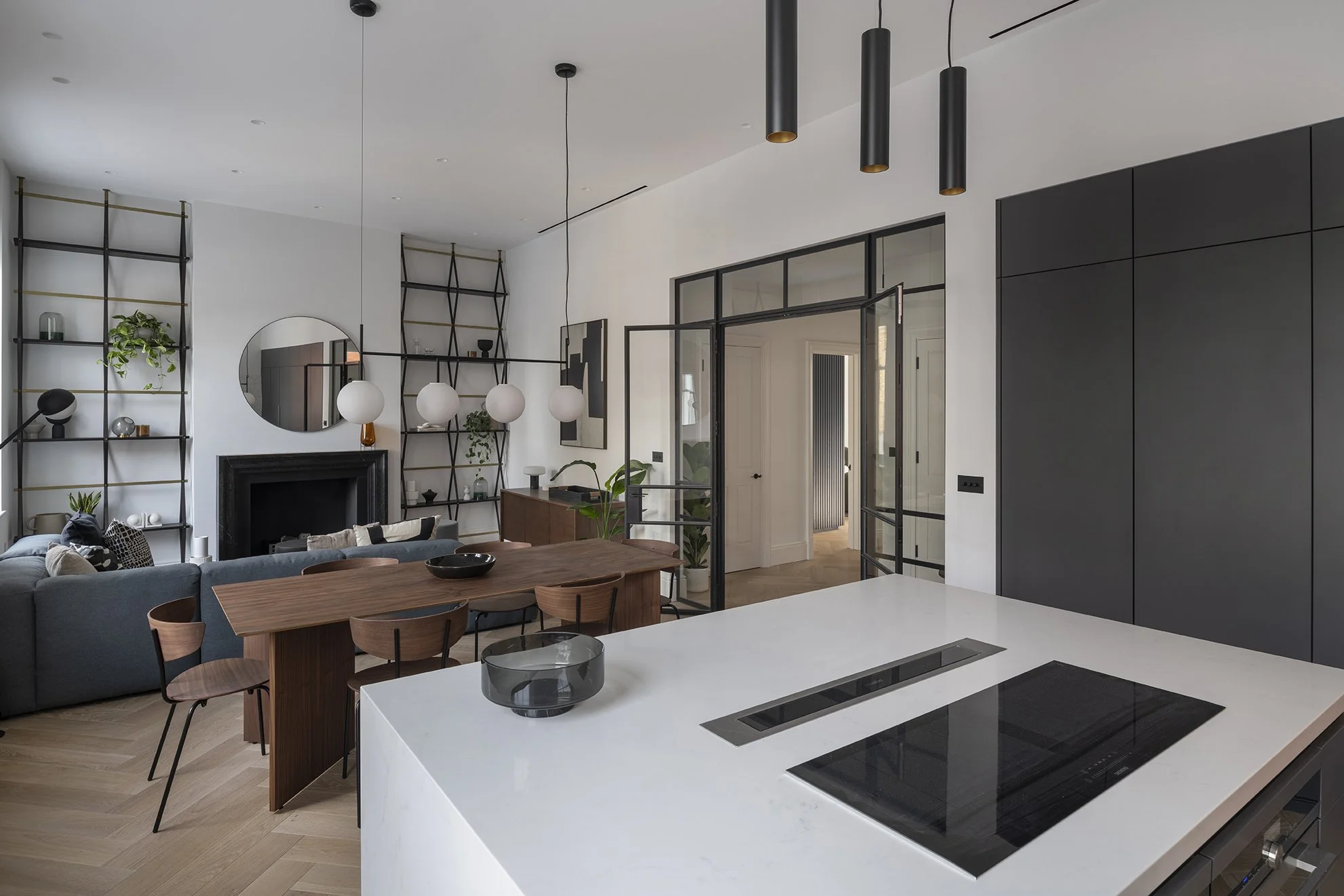 Stylish interior furniture and fittings have been selected to create calm and practical spaces. Interior crittall doors bring in light and zone spaces, whilst the joinery has been designed for efficient design layout.